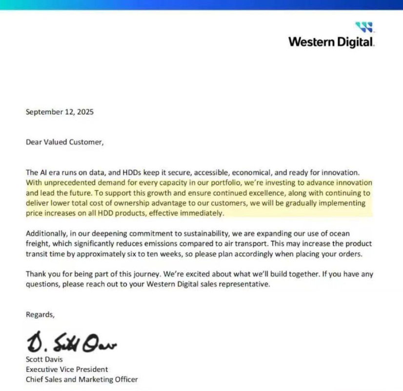 Scott Davis, senior vice president and chief sales and marketing officer of Western Digital, said in the document that the price adjustment was based on the unprecedented market demand for the entire line of mechanical hard drives , with the aim of supporting business growth, maintaining quality, and continuing to provide customers with lower TCO.
